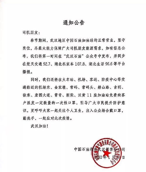 中国石油:武汉加油站正常营业,天然气供应充足,免费派发一次性口罩