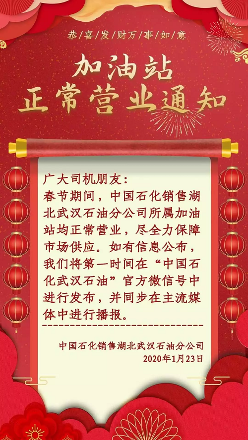 1月23日,中国石化表示,春节期间中国石化销售湖北武汉石油分公司所属加油站均正常营业,尽全力保障市场供应。网传“断油”消息不实,市民不必恐慌,不必提前集中到加油站加油。