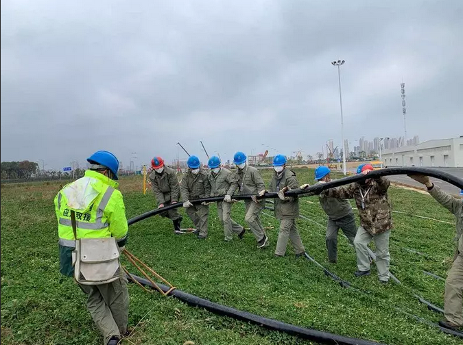国网武汉供电公司员工在江夏区雷神山医院电力配套工程现场施工。
