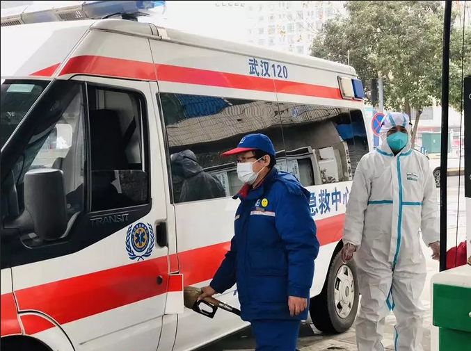 中国石化湖北武汉石油菱角湖加油站员工为救护车辆加油。