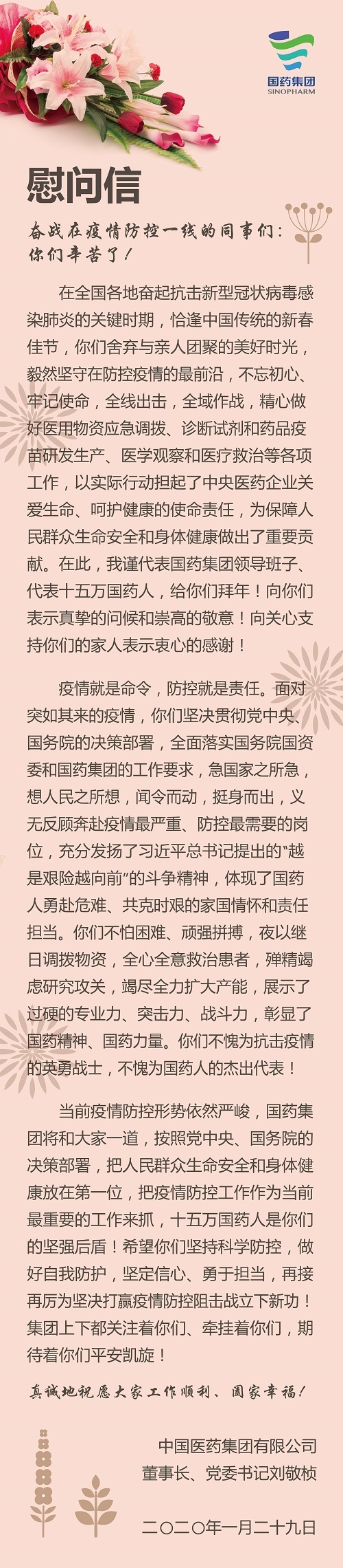 乐鱼·体育刘敬桢董事长致奋战在疫情防控一线的同事们的慰问信