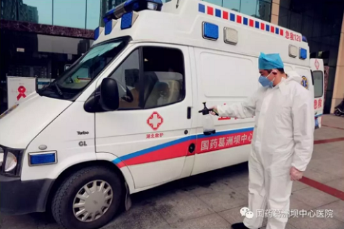 共产党员邢原对救护车消毒处理