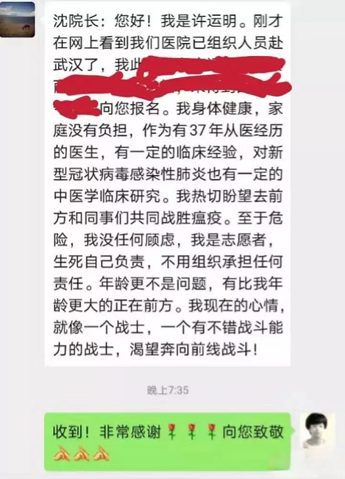 1月28日,扬州市中医院党委书记、院长沈雨春收到一条特别的微信:“沈院长:您好!我是许运明。我身体健康,家庭没有负担,作为有37年从医经历的医生,有一定的临床经验,对新型冠状病毒感染性肺炎也有一定的中医学临床研究。我热切盼望去一线和同事们共同战胜瘟疫。至于危险,我没任何顾虑,我是志愿者,生死自己负责,不用组织承担任何责任。年龄更不是问题,有比我年龄更大的正在前方。我现在的心情,就像一个战士,一个有不错战斗能力的战士,渴望奔向前线战斗!”许运明同志作为天江药业一名退休的老党员,冲在一线,敢为人先,在这场全民战“疫”中,展现了共产党员的赤子之心。
