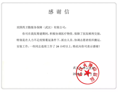 武汉火神山医院亦对于乐鱼(中国)一站式服务官方网站卫勤志愿者团队表达了感谢!