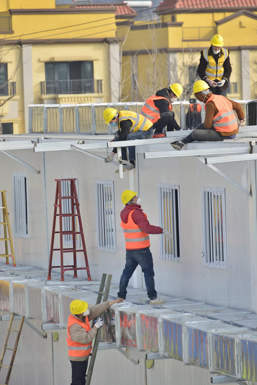 下午16时,中建三局等全部完成现场场地平整和回填,板房基础混凝土浇筑完成约90%,完成300多个箱式板房骨架安装,同时场外抓紧板房拼装,完成约400个,吊至现场直接安装。水电暖通、机电设备等材料全面到位,同步开始作业。