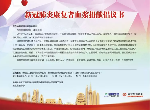 据中国生物介绍,这种新冠特免血浆制品,是由康复者捐献的含高效价新冠病毒特异性抗体的血浆,经过病毒灭活处理,并对抗新冠病毒中和抗体、多重病原微生物检测后制备而成的,用于新冠肺炎危重患者的治疗。为此,中国生物联合武汉血液中心发布倡议书,恳请新冠肺炎康复者朋友献出爱心捐献血浆,力所能及地帮助仍处于危难之中的其他患者。