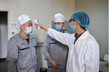 新华社照片,乌鲁木齐,2020年2月22日 新疆乌鲁木齐:防疫不松劲 复工干劲足 2月22日,在乐鱼·体育新疆制药有限公司,工作人员在测量体温。 连日来,新疆乌鲁木齐部分企业在确保做好防疫工作的前提下,安全有序复工,复工企业主要以电力、热力、食品、化工企业等急需物资重点企业以及生活保障企业为主。 新华社记者 丁磊 摄