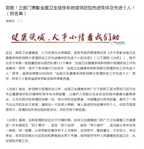 今日,国家卫生健康委、人力资源社会保障部、国家中医药管理局印发《关于表彰全国卫生健康系统新冠肺炎疫情防控工作先进集体和先进个人的决定》。