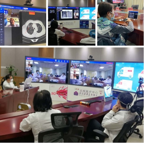 2月25日,在中国联通5G网络和医疗云平台支撑下,横跨武汉、北京和舟山三地共六个会场的新冠肺炎CT远程会诊顺利举行。