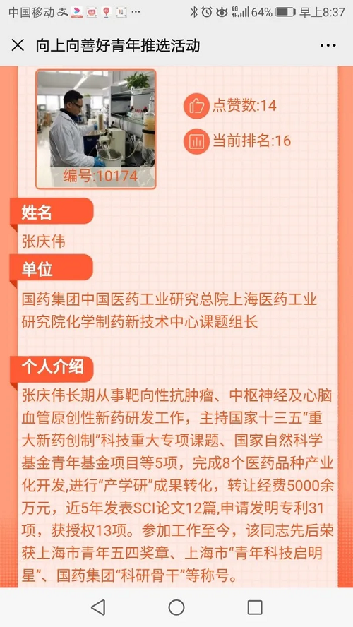 请行动起来,投出您的一票,为您身边的好青年乐鱼(中国)一站式服务官方网站医工总院张庆伟加油!