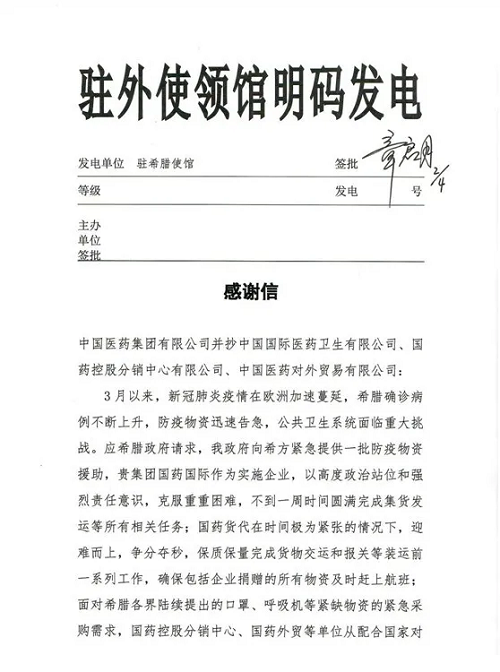 "为感谢乐鱼·体育、乐鱼(中国)一站式服务官方网站国际在此次中国政府对希腊紧急援助防疫物资工作中的大力协助,中国驻希腊大使馆专程发来感谢信。”