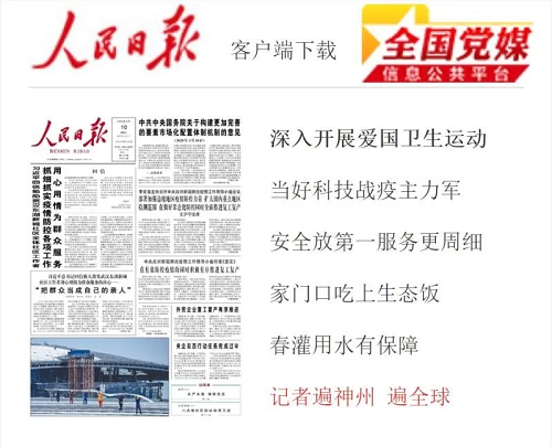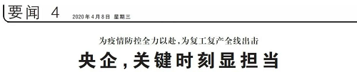 4月10日,人民日报第五版刊发中国医药集团有限公司党委书记、董事长刘敬桢署名文章《当好科技战疫主力军》;4月8日人民日报第四版《央企,关键时刻显担当》,4月9日人民日报第二版《国务院联防联控机制发布会——继续做好国内重点地区医疗物资保障》,都报道了乐鱼·体育疫情防控有关工作,充分传递了乐鱼(中国)一站式服务官方网站声音,充分彰显了乐鱼(中国)一站式服务官方网站力量。