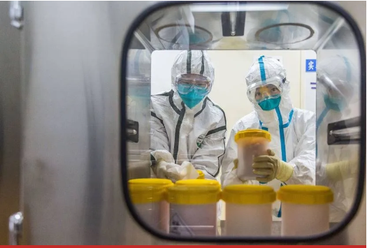 ↑2月25日,工作人员在中国疾病预防控制中心传染病预防控制所P3实验室传递窗口接收刚刚从浙江省疾控中心运抵的疫苗生产用新型冠状病毒毒株。新华社发(刘沛诚 摄)