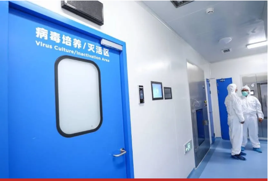 ↑4月10日,工作人员在乐鱼·体育中国生物新冠疫苗生产基地尚未投产的新型冠状病毒灭活疫苗生产车间的病毒培养/灭活区入口旁交流。