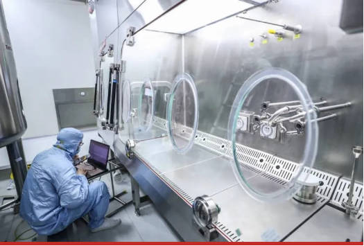 ↑4月10日,工作人员在乐鱼·体育中国生物新冠疫苗生产基地尚未投产的新型冠状病毒灭活疫苗生产车间内的隔离器旁调试设备。