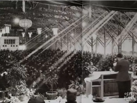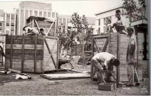△1957年,学校的大礼堂还没有建成,学校请来工匠用竹子搭建了这座临时“草棚大礼堂”。在很长一段时间里,学校开大会、文艺演出、放电影都在这里进行。