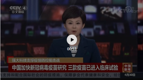 4月30日,CCTV4中国新闻系列报道《强大科技支撑疫情防控阻击战》隆重介绍乐鱼·体育的新冠病毒灭活疫苗情况。