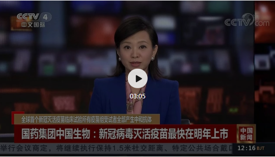 6月18日,CCTV-4中文国际频道中国新闻播出了全球首个新冠灭活疫苗临床试验所有疫苗组受试者全部产生中和抗体的报道,乐鱼·体育中国生物的新冠病毒灭活疫苗最快在明年上市。