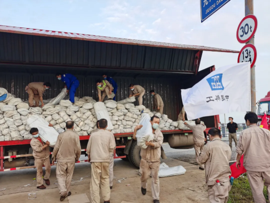 华中大区迅速集结120余名职工,带上雨衣、雨鞋、手电筒、手套、功能饮料、矿泉水等各类防汛保障用品。员工们来不及换下工装、皮鞋就火速赶往现场。