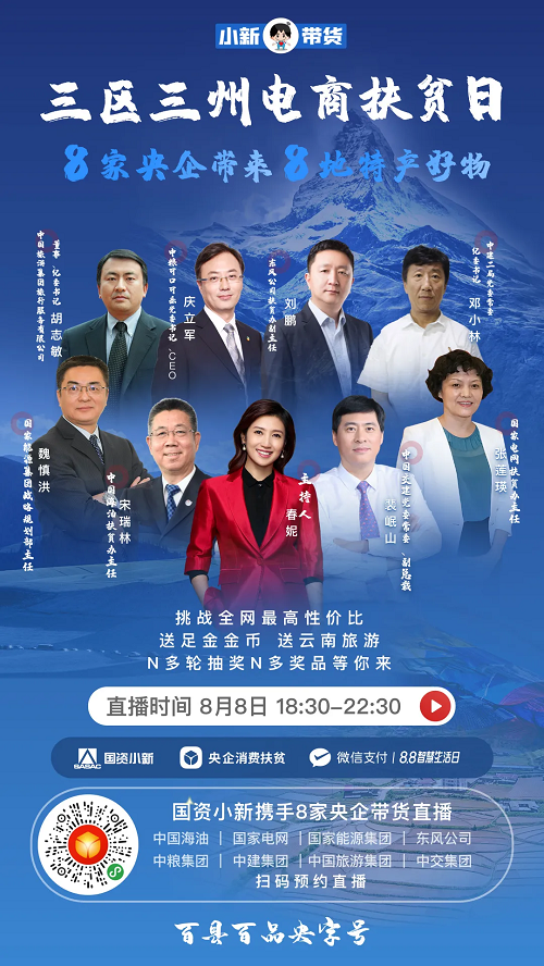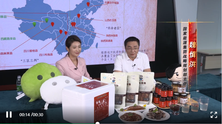8家中央企业携手定点扶贫的县市亮相直播间,包括中国海油帮扶的甘肃甘南州合作市,国家电网帮扶的青海果洛州玛多县,国家能源集团帮扶的四川凉山州普格县,中交集团帮扶的云南怒江傈僳族自治州、东风公司帮扶的西藏昌都地区贡觉县,中粮集团帮扶的四川甘孜州石渠县,中建集团帮扶的甘肃临夏州康乐县、卓尼县、康县和中国旅游集团帮扶的云南迪庆州香格里拉市。