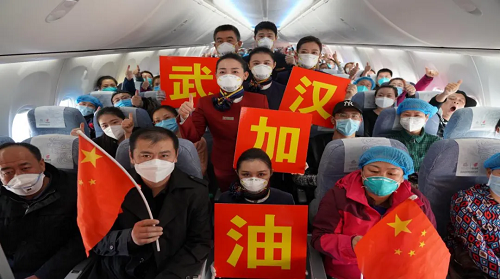 ▲2月15日至16日,国航内蒙古公司2天执飞3架救援包机,30小时内紧急运送内蒙古自治区三批医疗队243名医护人员、13.7吨医疗物资驰援湖北武汉。图为第六批医疗队与乘务组合影。