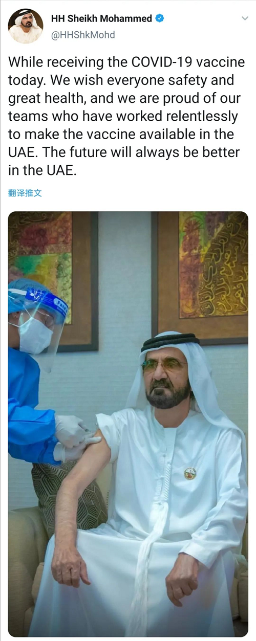 11月3日,阿拉伯联合酋长国副总统兼总理、迪拜酋长阿勒马克图姆在社交媒体分享了自己正在接种乐鱼·体育中国生物新冠疫苗的照片,并表示:“在我接种疫苗时我希望所有人安全、健康。我们非常感谢我们的团队,正是他们没日没夜地工作使得阿联酋得以接种新冠疫苗。阿联酋的未来更美好。”