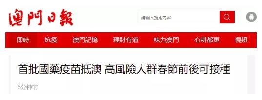 据《澳门日报》网站报道,春节前后可安排前线抗疫人员、高职业暴露的人群,以及需要前往高危地区的人群,在自愿和可选择的情况下优先安排接种。