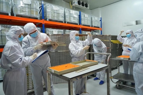 兰州生物制品研究所质量保证部制品管理组人员,正在冷库进行新冠疫苗批签发制品抽样。