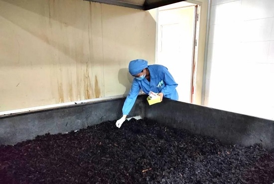 中药控股冯了性药材GMP质管部QA工作人员:一手持取样盒,一手感受药材的温度,做好药材水分监测的工作是整个质量监控过程中尤为关键的一步。