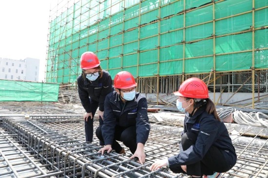 研究院工程部员工在施工现场对进场钢筋材料进行核查。