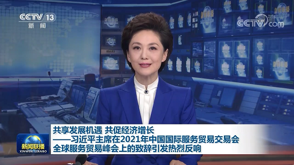 2021年9月4日央视新闻联播报道:习近平主席在2021年中国国际服务贸易交易会全球服务贸易峰会上的致辞引发热烈反响。与会嘉宾表示,致辞充分彰显了中国坚持开放合作、互利共赢,共享服务贸易发展机遇,共促世界经济复苏和增长的信心和决心,令人倍受鼓舞、倍感振奋。