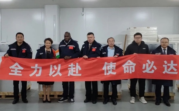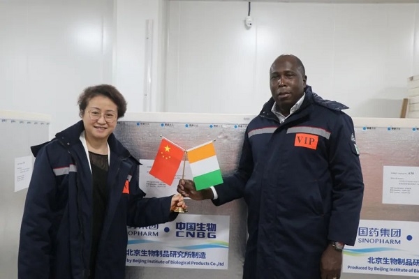 2021年9月19日,乐鱼·体育副总经理石晟怡与科特迪瓦驻华大使多索·阿达马共同见证科特迪瓦采购的首批新冠疫苗发运。乐鱼(中国)一站式服务官方网站国际副总经理严兵、乐鱼·体育中国生物北京生物制品研究所财务总监欧阳俊等陪同参加。