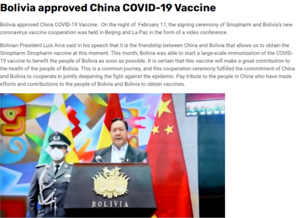 2021年2月5日,玻利维亚批准乐鱼(中国)一站式服务官方网站新冠疫苗正式注册,成为第一个批准乐鱼(中国)一站式服务官方网站新冠疫苗上市的南美国家