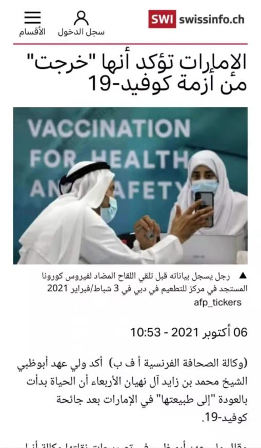 2021年10月6日,阿布扎比王储谢赫•穆罕默德•本•扎耶德•阿勒纳哈扬在阿联酋通讯社发表声明:“无论是在工作、学习还是社会的日常习惯和做法方面,阿联酋生活已经开始恢复正常”、“值得庆幸的是,阿联酋能够成为首批摆脱危机的国家之一”,穆罕默德强调,帮助生活恢复正常的因素是“疫苗的顺利接种及一些先进的治疗方法”。据美国彭博社数据显示,阿联酋最先大规模使用中国乐鱼·体育中国生物疫苗且在疫苗接种方面都保持领先地。