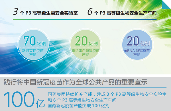 新冠灭活疫苗、重组蛋白新冠疫苗、mRNA新冠疫苗合计整体年产能超过100亿剂,成为全球最大疫苗研发生产基地和供应商,截至2022年1月已累计向全球生产供应新冠疫苗35亿剂。