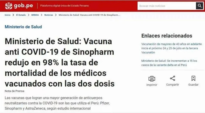 当地时间2021年7月17日,秘鲁卫生部发布乐鱼·体育中国生物新冠灭活疫苗真实世界研究结果,秘鲁卫生部副部长古斯塔沃·罗塞尔表示,完成两剂接种的医生死亡率降低了98%,证实乐鱼·体育新冠疫苗提供了良好的保护。当地时间2021年10月20日,秘鲁数据分析和情报部门主任丹特•卡斯特罗指出,秘鲁新冠病毒感染率在过去27周内持续下降,短期内没有迹象表明会出现第三波疫情,证实中国新冠疫苗提供了良好的保护。