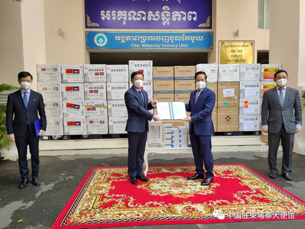 2021年8月11日,中国驻柬埔寨大使王文天出席中方向金边市政府捐赠抗疫物资交接仪式