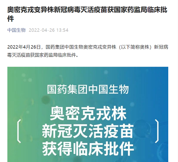 4月26日,中国生物北京生物制品研究所奥密克戎变异株新冠病毒灭活疫苗获得了中国国家药监局颁发的临床批件。中国生物将采用随机、双盲、队列研究的形式,在已完成2或3剂新冠疫苗接种的18岁及以上人群中进行序贯免疫临床研究,评价奥密克戎变异株新冠病毒灭活疫苗的安全性和免疫原性。