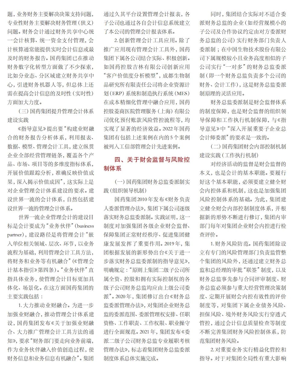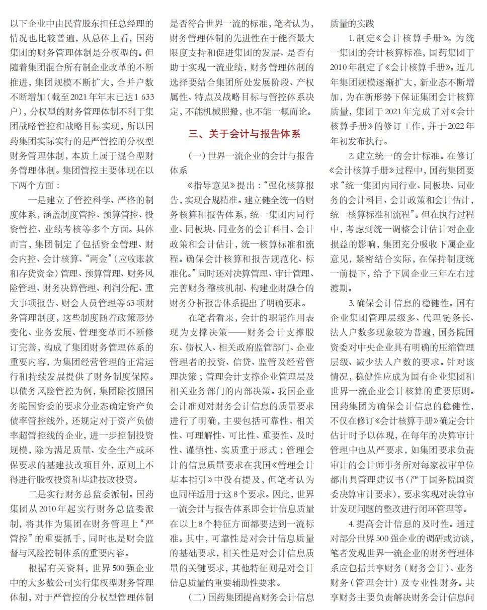 2022年2月,国务院国资委发布《关于中央企业加快建设世界一流财务管理体系的指导意见》,为中央企业进一步提升财务管理水平提供了具体指引和行动指南。中国医药集团有限公司(以下简称乐鱼·体育)以建设 世界一流企业为目标,紧密结合集团管控和业务实际,构建并不断优化财务管理体制、会计与报告体系、财会监督与风险控制体系,创新并持续完善独具特色的提质增效工作体系,取得了积极的成效。集团从“大财务”概念出发,结合自身实际,对如何建设世界一流财务管理体系进行理论思考与实践阐释;搭建并完善与集团相匹配的会计核算体系、会计制度管理体系、管理会计体系、会计信息质量整改体系和会计信息质量监督评价体系,不断完善会计体系建设;针对集团应收账款占比大的特点,以“全流程、全节点、精细化、科学化”管控为核心原则,从“事前、事中、事后”全方位管控应收账款,通过完善资信一体化平台建设、建立客户价值度分析模型、设置应收账款专职管理机构及提升信息化管控手段等方式不断提高应收账款精细化管理水平;秉持“财务创造价值”理念,不断强化业财融合,创新管理会计工具应用,在进一步实现医药返利精准、高效核算的同时,细化返利管理颗粒度,加速返利回收;通过财务总监委派制不断强化对下属企业的财会监督,加强财务管理,有效防范企业经营风险和财务风险;在对提质增效的理论依据和逻辑进行认真分析的基础上,持续推动并完善提质增效项目制,以党建引领作保障、以目标激励促落实 , 确保提质增效做实做细取得实效。乐鱼·体育开展的一系列务实、创新的财务管理体系建设实践对助力集团高质量发展和创建世界一流企业发挥了重要作用, 希望能为相关企业集团加强财务管控和建设财务管理体系提供参考和借鉴。