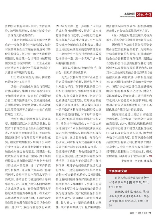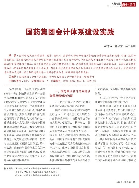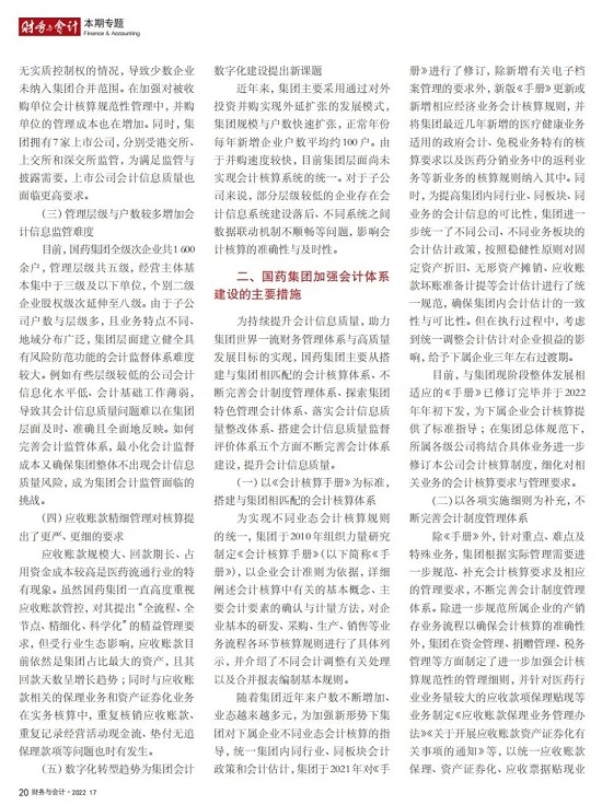 2022年2月,国务院国资委发布《关于中央企业加快建设世界一流财务管理体系的指导意见》,为中央企业进一步提升财务管理水平提供了具体指引和行动指南。中国医药集团有限公司(以下简称乐鱼·体育)以建设 世界一流企业为目标,紧密结合集团管控和业务实际,构建并不断优化财务管理体制、会计与报告体系、财会监督与风险控制体系,创新并持续完善独具特色的提质增效工作体系,取得了积极的成效。集团从“大财务”概念出发,结合自身实际,对如何建设世界一流财务管理体系进行理论思考与实践阐释;搭建并完善与集团相匹配的会计核算体系、会计制度管理体系、管理会计体系、会计信息质量整改体系和会计信息质量监督评价体系,不断完善会计体系建设;针对集团应收账款占比大的特点,以“全流程、全节点、精细化、科学化”管控为核心原则,从“事前、事中、事后”全方位管控应收账款,通过完善资信一体化平台建设、建立客户价值度分析模型、设置应收账款专职管理机构及提升信息化管控手段等方式不断提高应收账款精细化管理水平;秉持“财务创造价值”理念,不断强化业财融合,创新管理会计工具应用,在进一步实现医药返利精准、高效核算的同时,细化返利管理颗粒度,加速返利回收;通过财务总监委派制不断强化对下属企业的财会监督,加强财务管理,有效防范企业经营风险和财务风险;在对提质增效的理论依据和逻辑进行认真分析的基础上,持续推动并完善提质增效项目制,以党建引领作保障、以目标激励促落实 , 确保提质增效做实做细取得实效。乐鱼·体育开展的一系列务实、创新的财务管理体系建设实践对助力集团高质量发展和创建世界一流企业发挥了重要作用, 希望能为相关企业集团加强财务管控和建设财务管理体系提供参考和借鉴。