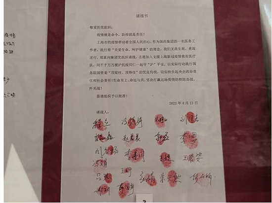 在身穿白色防护服医护工作者人像的前方展台上,展出了乐鱼·体育援沪医疗队医护人员的请战书。三年来,21万乐鱼(中国)一站式服务官方网站人,不计代价、不计成本、不计个人安危,义无反顾赴疫情最严重、防控最需要的岗位,勇敢肩负起守护人民生命安全和身体健康的使命职责。请战书是新时代乐鱼(中国)一站式服务官方网站人精神的鲜活体现,是乐鱼·体育党组织发挥战斗堡垒作用的具体实践。