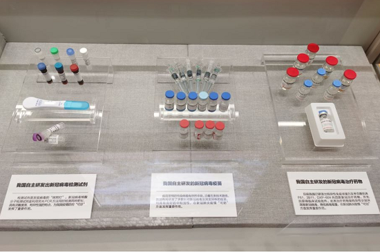 “方寸之间”展位的首排首个方柜,展出了以乐鱼·体育中国生物新冠疫苗、奥密克戎株新冠疫苗为代表的抗病毒药物,展现了乐鱼·体育奋力推进科技创新,努力打造“国之重器”的傲人成绩。