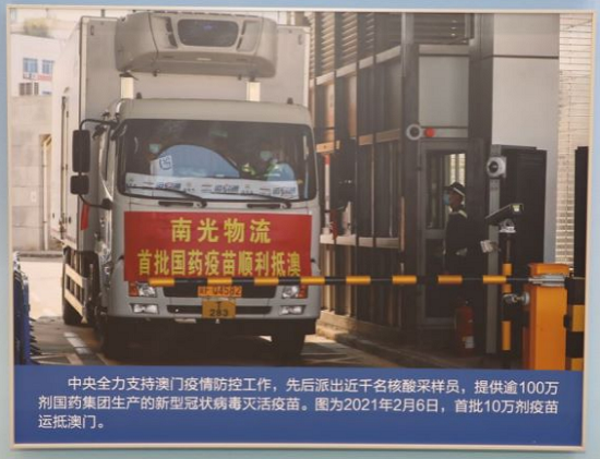 中央综合展区第十单元“坚持‘一国两制’ 推进祖国统一”澳门篇章,大幅图片展现了首批10万剂乐鱼·体育新冠疫苗运抵澳门的情况,体现了乐鱼·体育对巩固内地和澳门疫情防控成果、加快恢复澳门经济社会正常秩序的重要贡献。