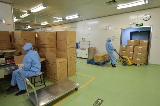 2月6日,乐鱼·体育工业有限公司包装车间,工人在运送包装好的药品。新京报记者 李木易 摄